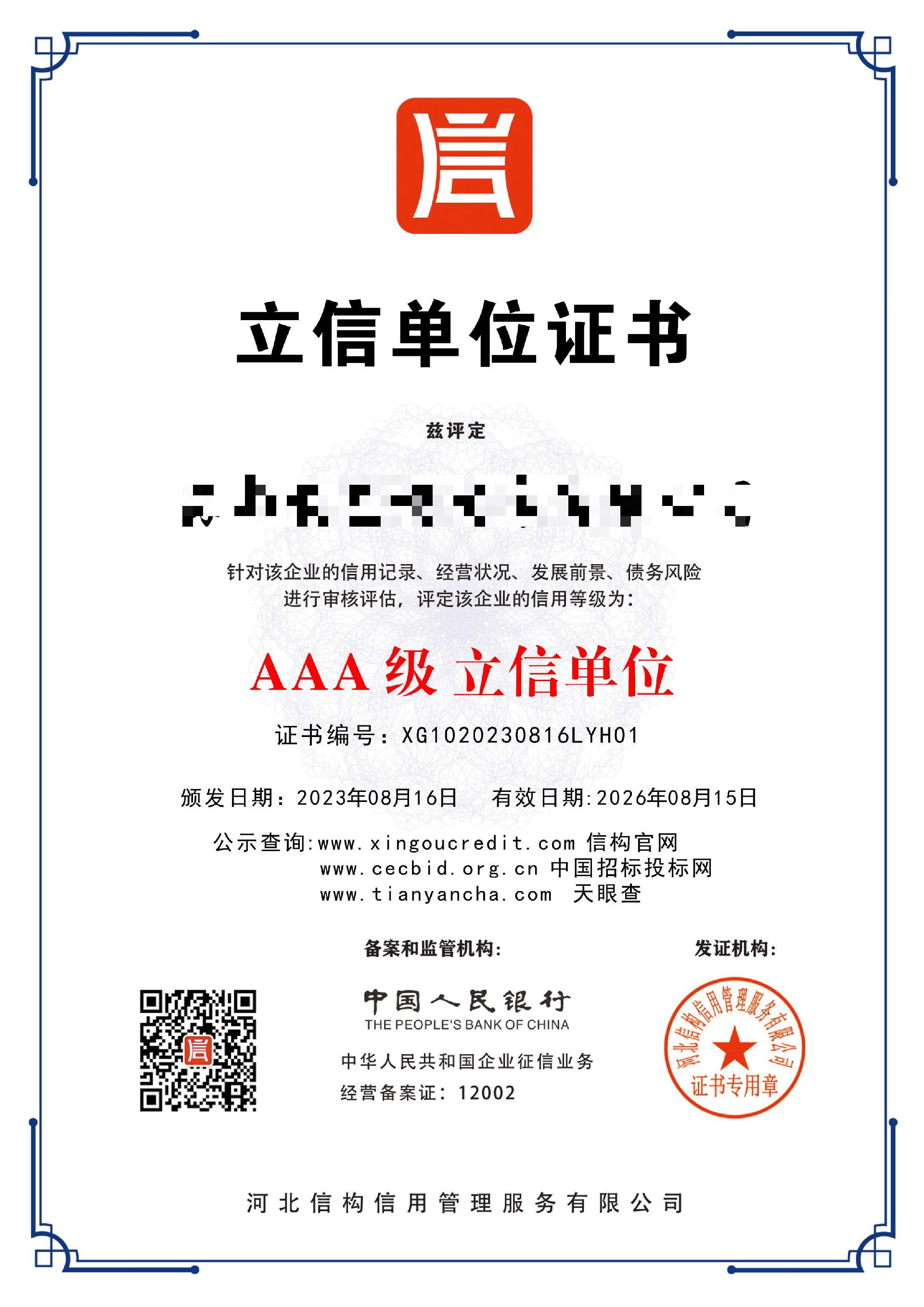3A認(rèn)證人民銀行備案的AAA級(jí)立信單位認(rèn)證證書有效期三年。